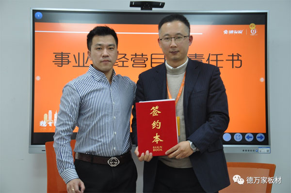 上海买板材事业部总经理与营销人员签订销售任务责任书。